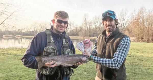 Edward is pictured with the prize trout and Sportfish team member, Nick Clewlow, handing over his cash prize.