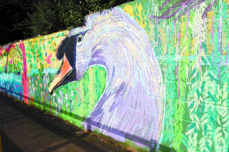 A nature-themed mural depicting words from poet Robert Frost’s The Road Not Taken has been painted onto a large wall along the footpath walkway, which was formerly covered in graffiti.