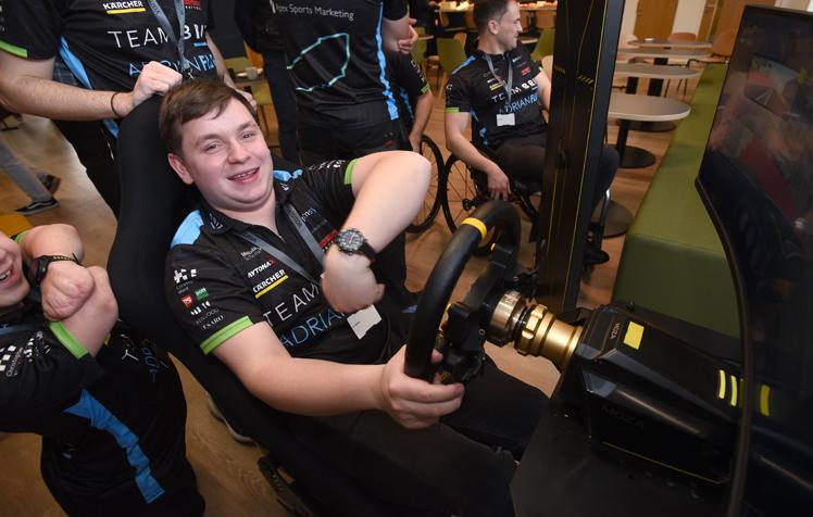 The simulator demonstrated the advanced hand-control technology that enables drivers with disabilities to race competitively on equal terms with able-bodied competitors.
