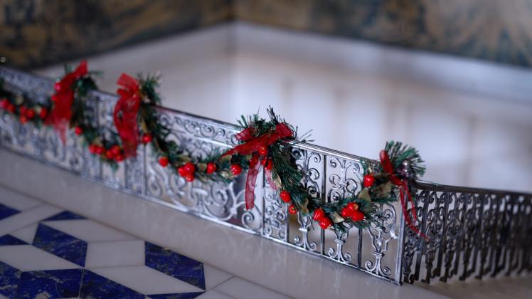 The Crimson Drawing Room, one of the Semi-State Rooms open only in winter, contains a second tree standing 16 feet high, set against the room’s red silk walls and gilded detailing.