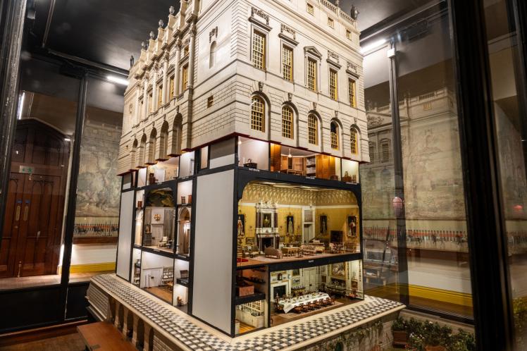 Visitors to Queen Mary’s Dolls’ House can see a miniature Christmas scene, including a 45cm tree decorated with ornaments made from repurposed glass beads and tiny candles made from real wax.