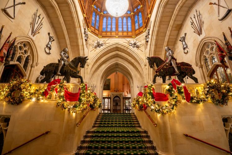 St George’s Hall features a 20-foot Nordmann fir grown in Windsor Great Park, decorated with more than three thousand lights and green and gold ornaments, with garlands draped along the balconies beneath the vaulted ceiling.