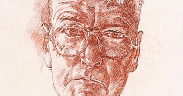 Spencer’s self-portrait, created a few months before his death in 1959, features his characteristic sharp fringe, a hairstyle he wore all his life, above a ‘grim, sloping downturn of the mouth.’