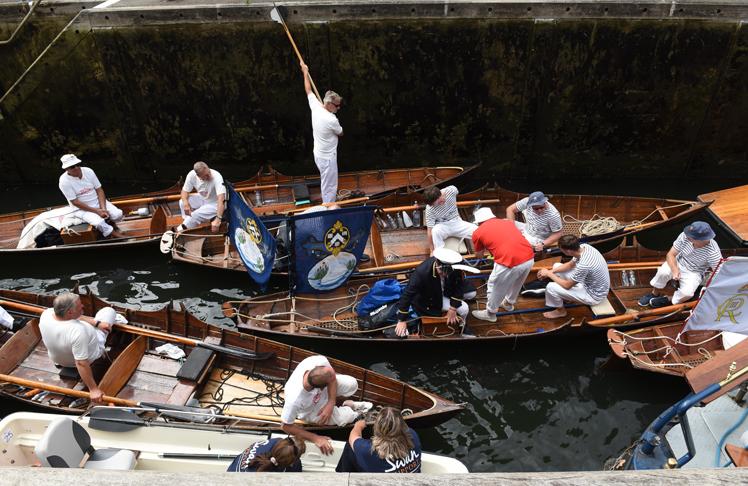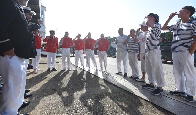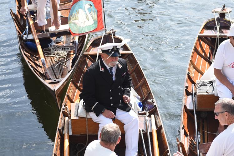 The boats fly the appropriate pennant and flag.