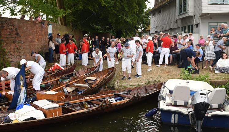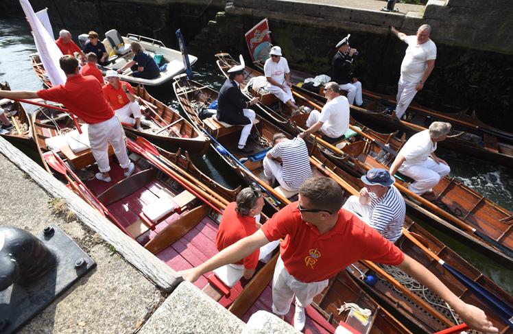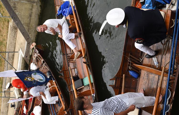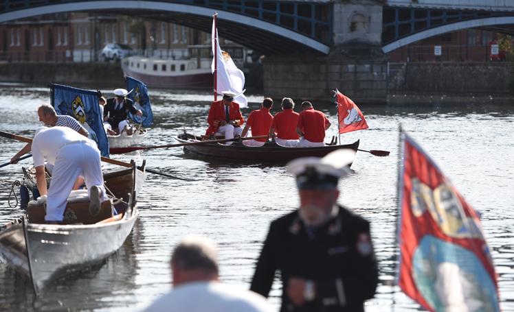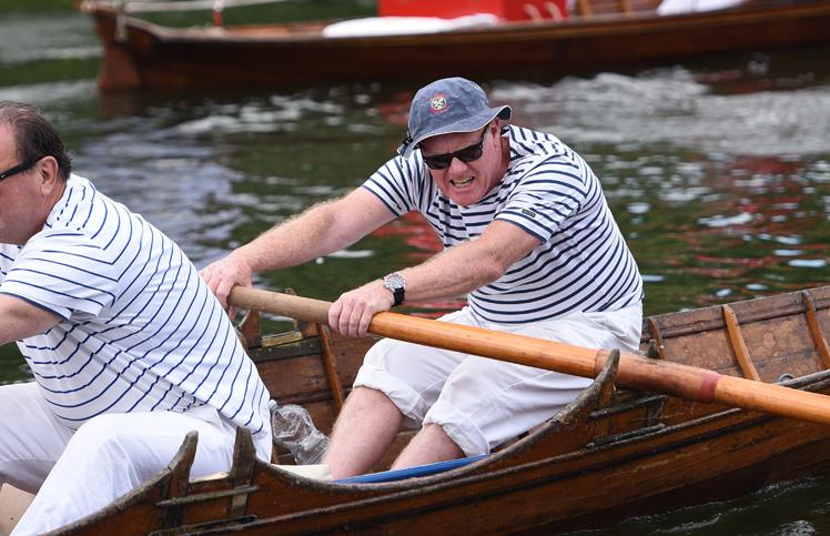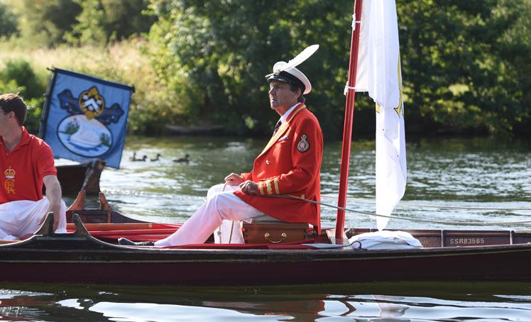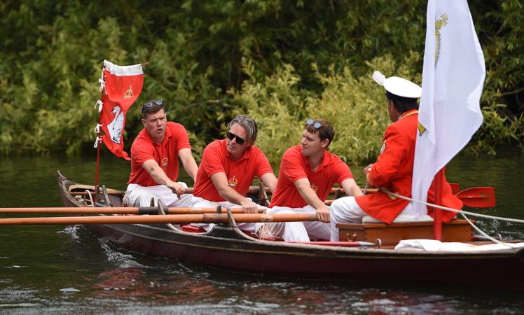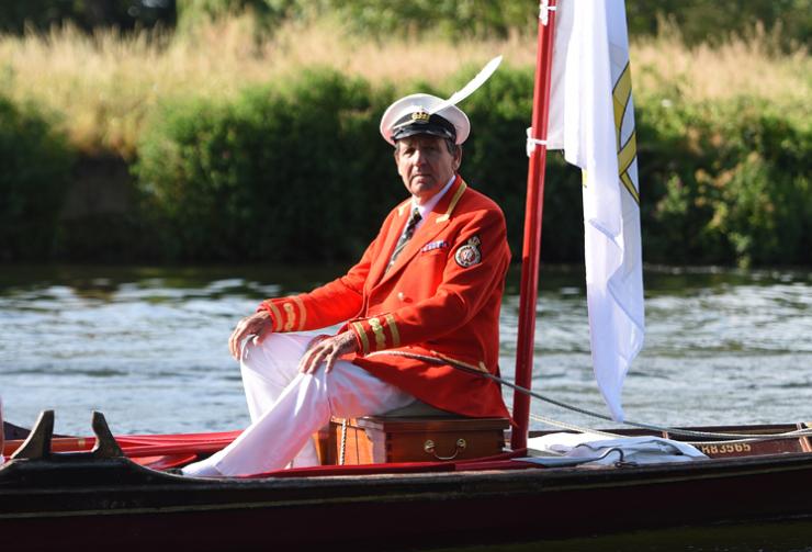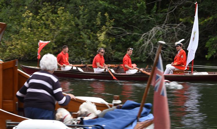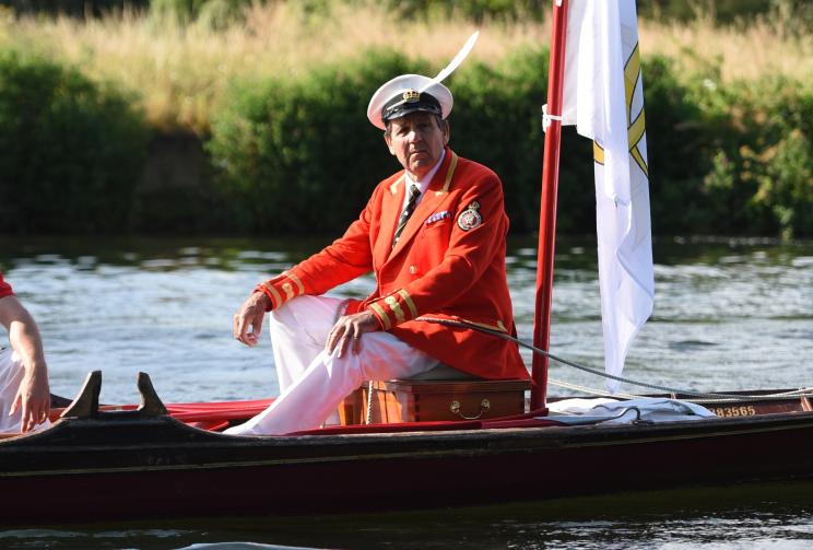 Mr Barber and the swan uppers traditionally wear scarlet uniforms and use traditional rowing skiffs on their five-day journey.