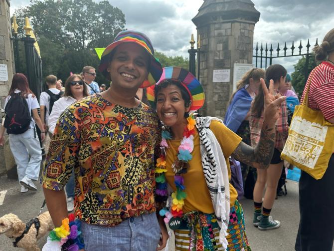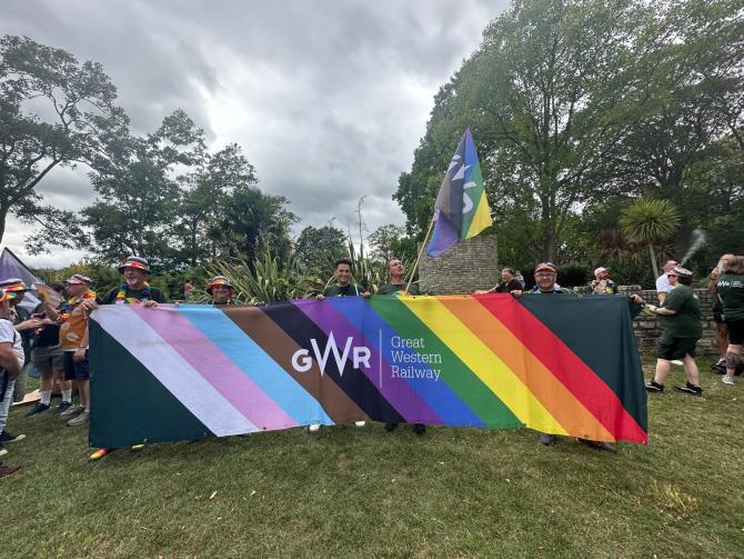 The event’s official partners Great Western Railway (GWR) had brought along their pride flag and banner and were handing out colourful pride hats and garlands for participants to wear.