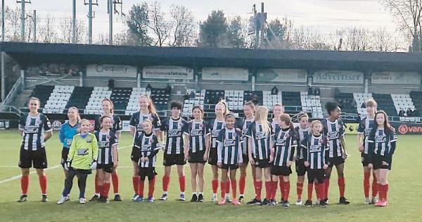 Maidenhead United Women’s team line up with mascots from the club’s u9s Girls and u12s Kites teams. Photo: Maidenhead United