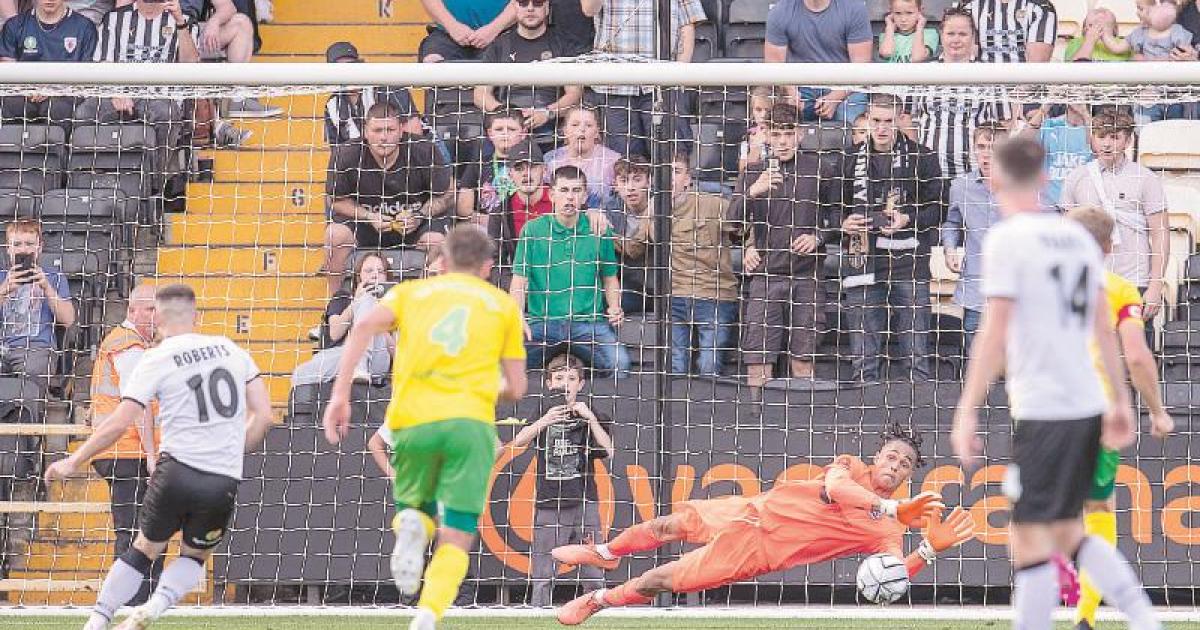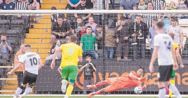 Rhys Lovett keeps out Callum Roberts’ spot kick. Photo: George Tewkesbury