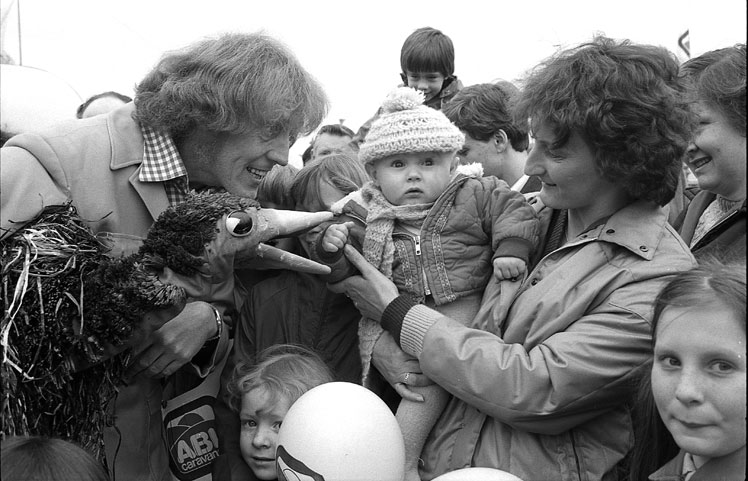 1981: Nine-month-old Gregory Harrison had mixed feelings about meeting Rod Hull and his irrepressible Emu at Harrington’s Caravan Centre in Reform Road.