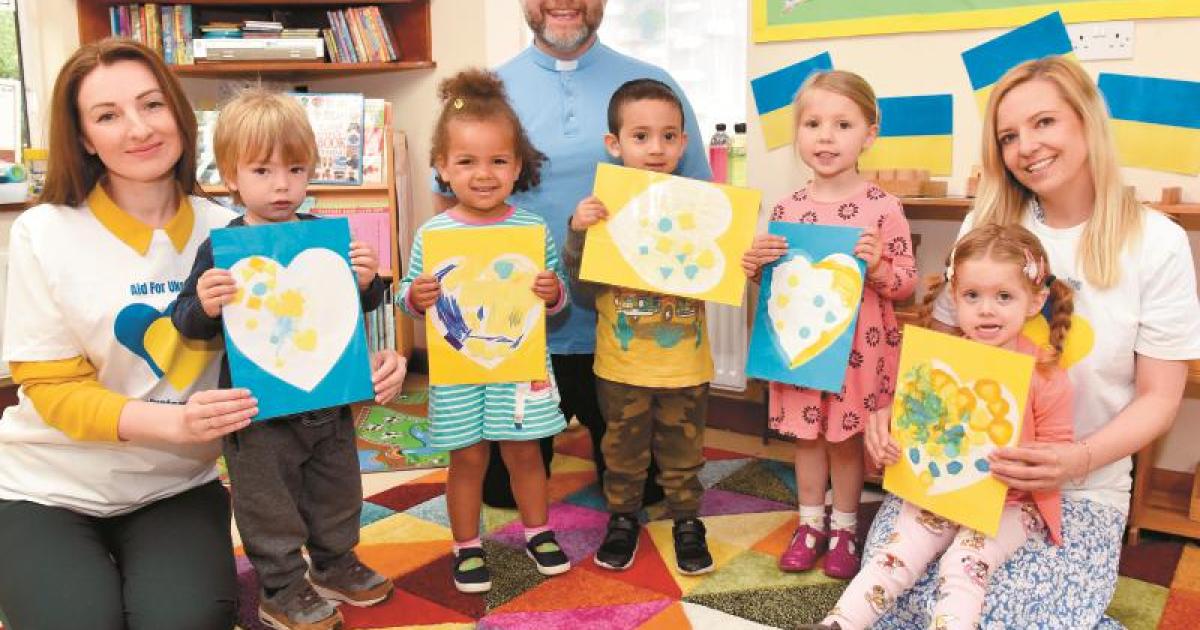 Pupils at Patchwork Montessori Day Nursery, in Chiltern Road, designed colourful pictures of Ukrainian hearts which are being attached to shoeboxes full of donations set for eastern Europe.