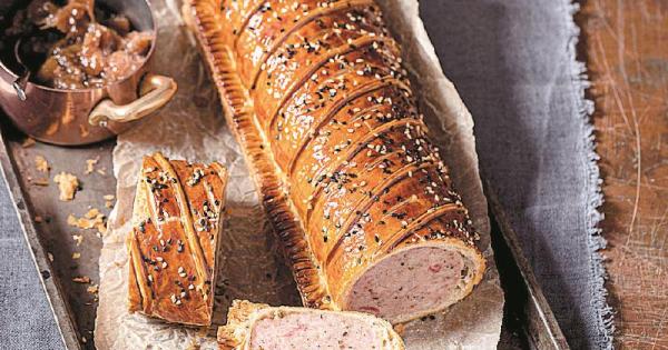 9. Trim a little off the fluted seam of the pastry to neaten it into a straight edge, then brush a final layer of egg wash all over the sausage roll. Sprinkle the black and white sesame seeds along the top of the roll. Pop the tray into the preheated oven and bake the sausage roll for 25 minutes. Check the internal temperature of the filling with a digital probe thermometer – you are looking for 75°C or above. If necessary, return the sausage roll to the oven and check the temperature again every five minutes until it reaches 75°C. Alternatively, insert a metal skewer into the centre of the sausage roll and then press it against your hand – it should be very hot to the touch.