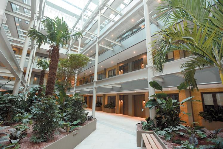 The building features apartments spread across multiple floors, a glass elevator as well as a glass roof which sees sunlight beam through onto the building’s internal gardens.