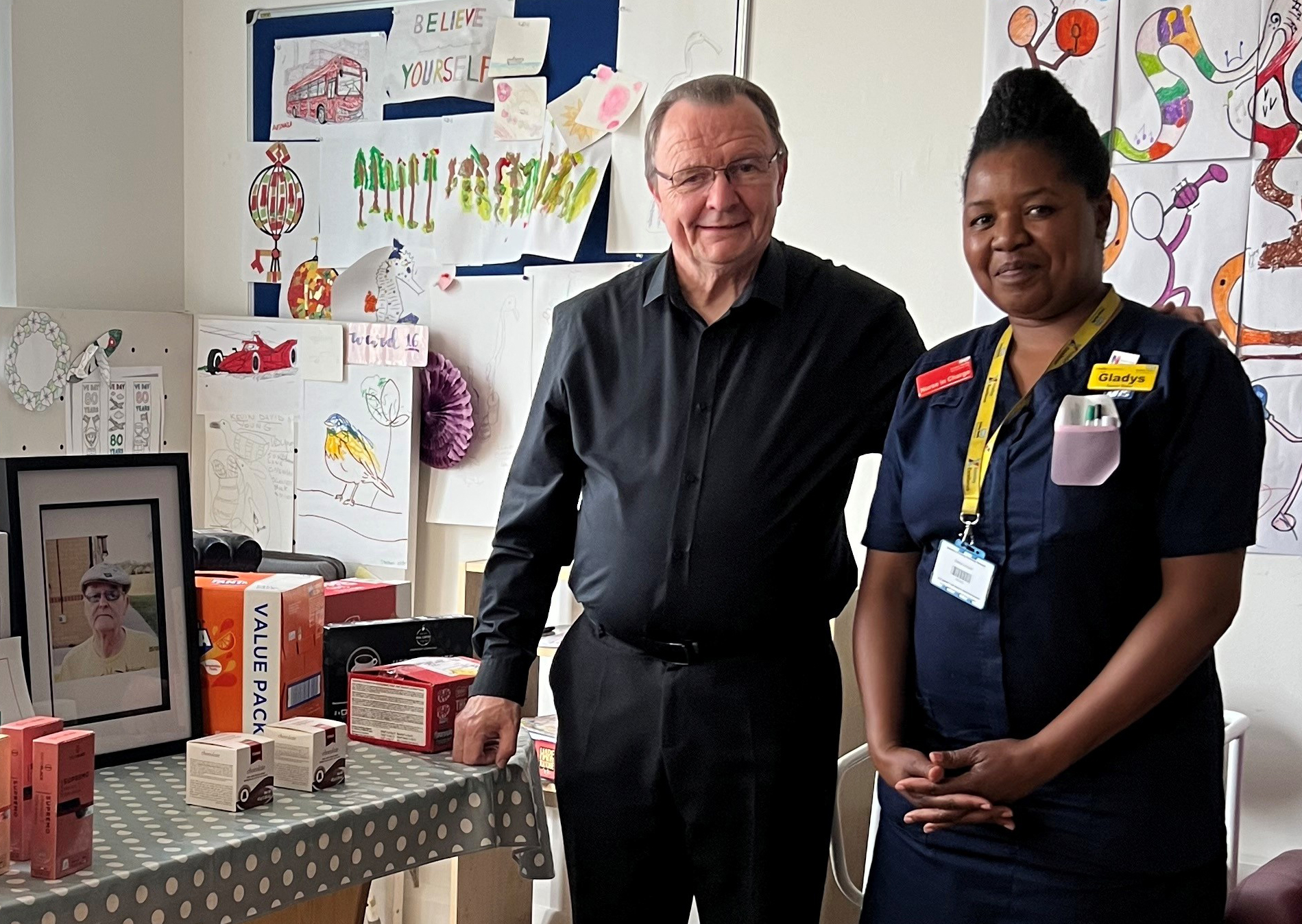 Ian with nurse in charge, Gladys, alongside gifts for the nurses and a picture of Stephen.