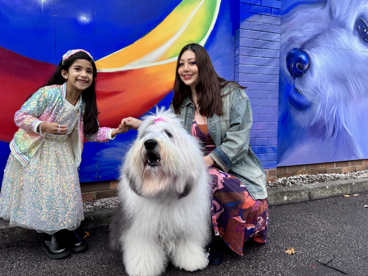 A white dog features alongside Nyraa as a symbol of companionship, inspired by the Old English Sheepdog Dulux mascot.