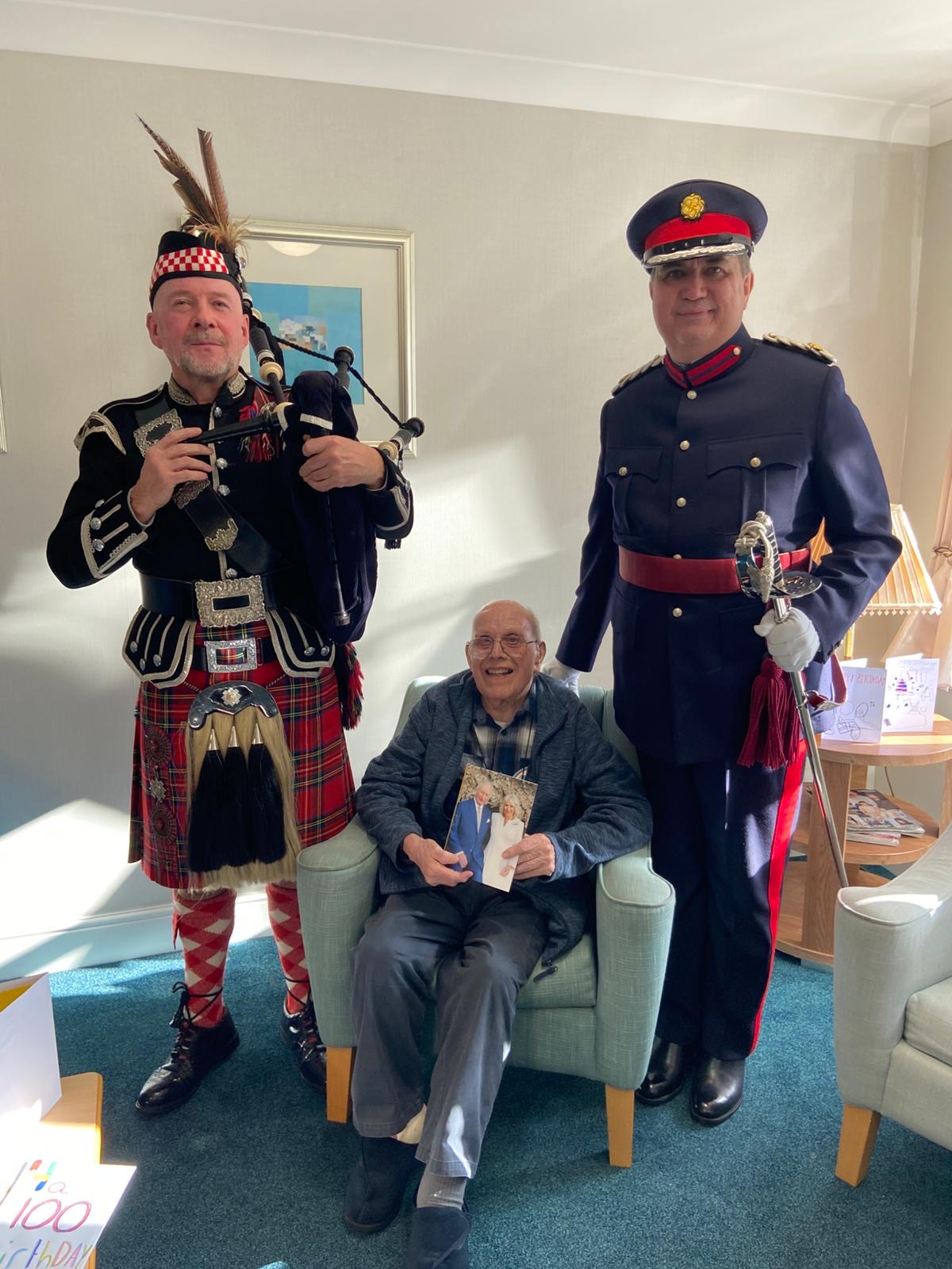 After reaching 100 years old last week, Ted celebrated in style with family, fellow residents and a bagpiper from his old regiment.