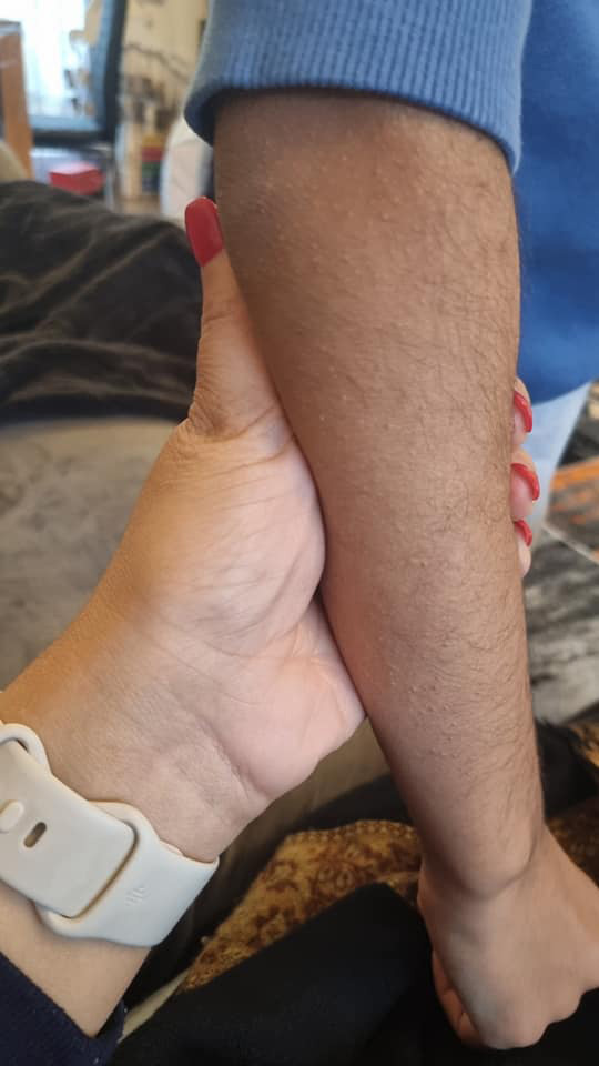 Mrs Kaushal Sharma’s son's arm with 'goosebumps' which turned out to be a strep A rash - and with 'strawberry tongue', another symptom.