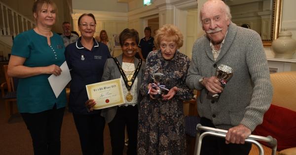 Joyce Pearson, 93 and Colonel John Fricker, 90, residents of Harwood House Nursing Home in Spring Lane, were awarded the male and female ‘Storks Cup’ on Wednesday, June 12.