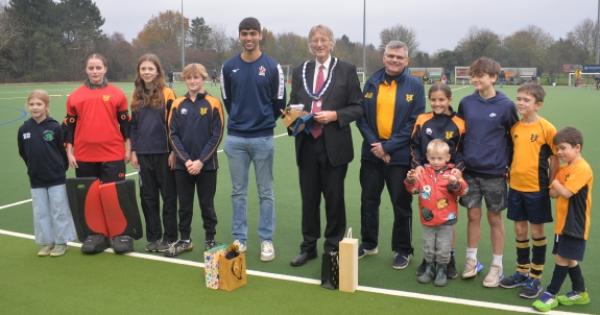 James Mazarelo joined players at Henley Hockey Club for the ribbon-cutting ceremony at the 2G artificial pitch in Jubilee Park, off Reading Road.