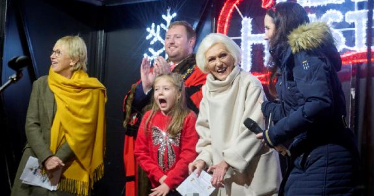 This year’s celebrity guest, Dame Mary Berry, was accompanied by Mayor Rory Hunt and seven-year-old Clemmie O’Hanlon, the winner of his Christmas card design competition.