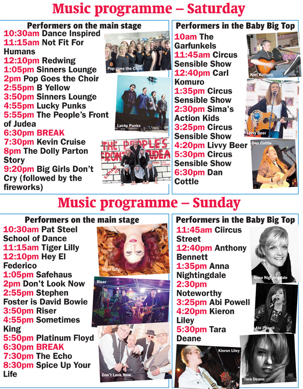 Sunday’s headline acts will be British power pop band The Echo followed by top Spice Girls tribute act Spice Up Your Life.
