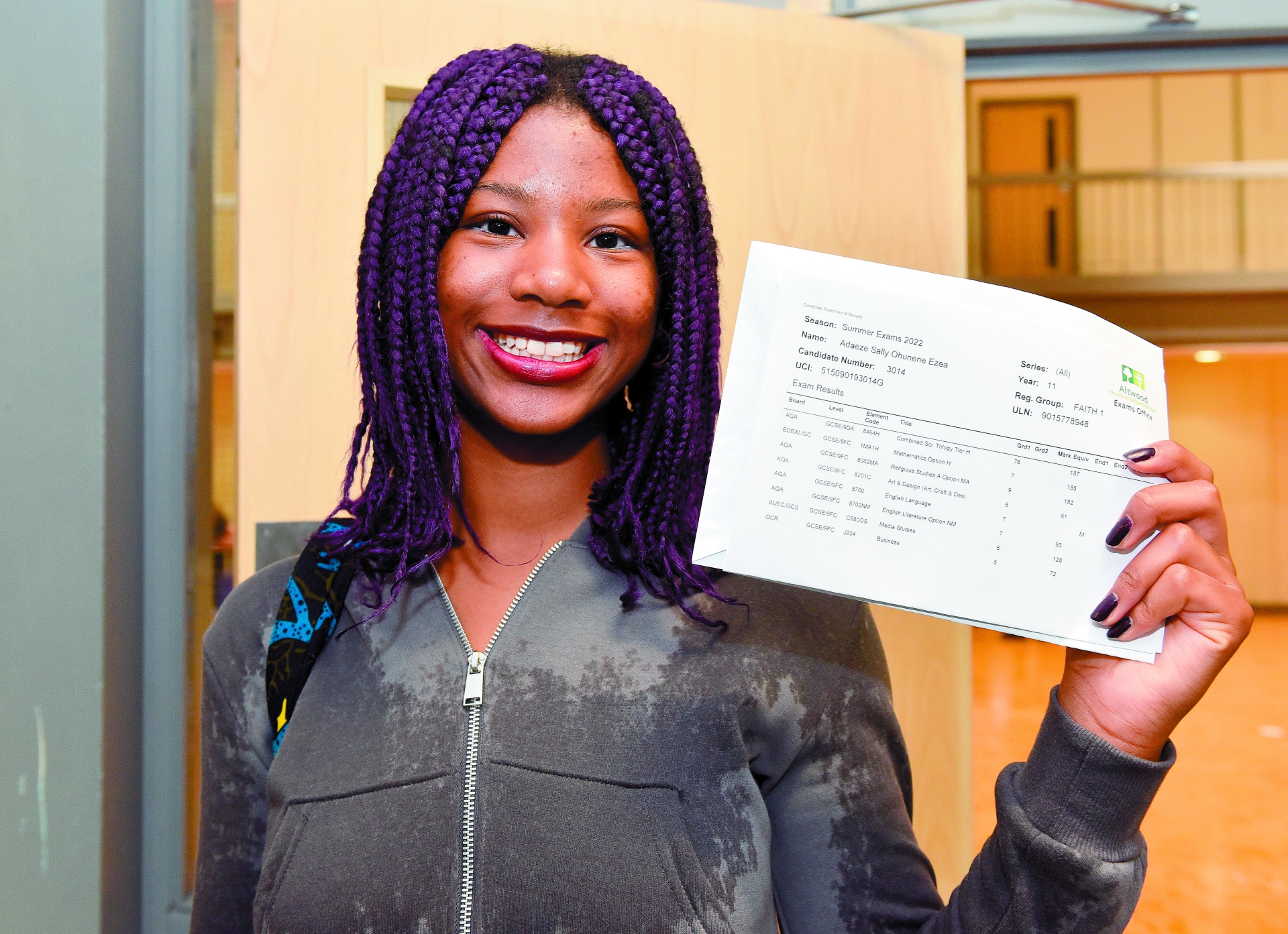 Student Adaeze Ezea, 16, said she was ‘really happy’ to receive her results, which included a grade 9 in RE, and grade 7s in maths, English language and English literature.