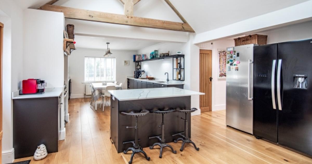 Inside, you step into a generous hall with wood flooring and oak-panelled doors that continue through the house. There’s a separate sitting room at the front with a wood-burner, the snug place for a quiet read, and a utility room off the inner hall, so laundry and boots have somewhere sensible to go.
