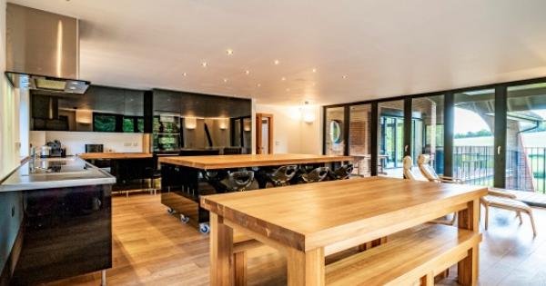 The large kitchen and family room has a wood-burning stove and bifold doors on to the deck in both south and west aspects.
